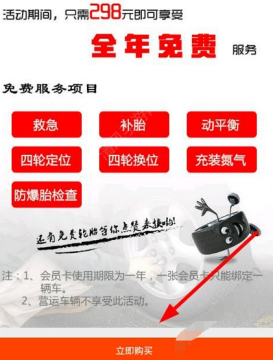 2、进入“活动介绍”页面,我们可以看到在活动期间,只需298购买VIP会员就可以享受全年免费服务,包括救急、补胎、动平衡,最重要的是成为VIP之后就可以参与点赞得收益的活动,点击下方“立即购买”就可以购买成功了哦!