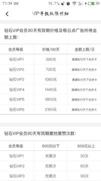 钻石VIP会员90天有效期价格及每日点广告所得金额上限: