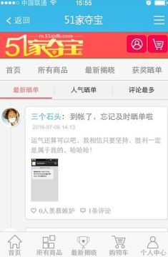 3、获得商品:当所有号码都被分配完毕后,系统根据规则计算出1个幸运号码,持有该号码的用户,直接获得该商品。 幸运号码计算规则1、商品的最后一个号码分配完毕后,将公示该分配时间点前本站全部商品的最后100个参与时间;2、将这100个时间的数值进行求和(得出数值A)(每个时间按时、分、秒、毫秒的顺序组合,如20:15:25.362则为201525362);3、为保证公平公正公开,系统还会等待一小段时间,取最近100条时间记录之和除以本商品总需参与人数;4、(数值A+数值B)除以该商品总需人次得到的余数 + 原始数 10000001,得到最终幸运号码,拥有该幸运号码者,直接获得该商品。 这样看来51家夺宝还是很安全,并且是真的!
