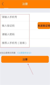 3、在注册页面中输入手机号、手机短信验证码、密码,如果有推荐人填写推荐人手机号,没有的话可以不填,然后点击注册即可。