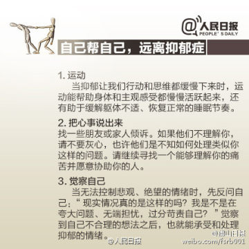 作者:腾牛小编 人气:0导读: 现在抑郁症患者数量在加大,就像是感冒一样广泛。小编查过,只要你没有到重度抑郁症,最好的方法不是吃药,因为药会破坏神经,大家不想成为傻子吧。那么最好的就是自我调节,再就是找一个开朗的人开导自己。