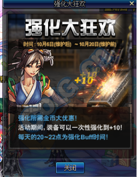 活动期间强化8.8折,开放强化到+10。活动期间,装备可以一次性强化到+10,强化所需费用8.8折,每天20~22点为强化Buff时间,还可以在凯丽商店买到幸运强化药剂&强化保护券