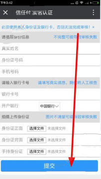 然后将下面的所有身份信息和银行卡信息全部填写完整,注意不要出错,点击“提交”按钮;