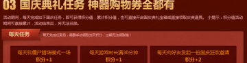 活动期间,每天完成如下国庆任务,即可获得积分值,累计积分值,也可直接开启国庆典礼宝箱或直接领取庆典道具。小提示:积分值活动期间可直接累计,活动结束后,将无法兑换。