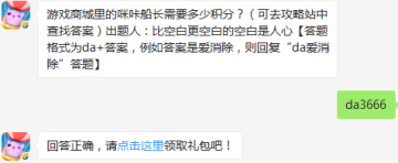 作者:腾牛小编 人气:0游戏商城里的咪咔船长需要多少积分?这里说的是天天爱消除每日一题,那么游戏商城里的咪咔船长需要多少积分?下面小编给大家带来天天爱消除10月12日每日一题的答案,一起来看看吧。