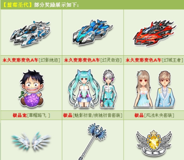 开启【蓝莓圣代】100%获得:角色经验卡+600,且有机会获得:永久变形变色A车【幻影绝迹】/【幻灵奇迹】/【幻域王者】、极品宠【草帽路飞】、极品套装【魅影初音/疾驰初音套装】或其他奖励之一!