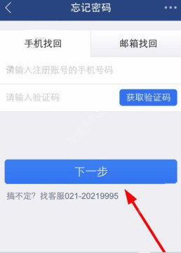 2、来到“忘记密码”页面之后你可以点击“手机找回”或“邮箱找回”,例如在“手机找回”页面中你需要输入注册账号的手机号码,然后点击“下一步”按钮系统提示一步步操作就ok了哦!如果还是解决不了问题可以联系客服021-20219995。