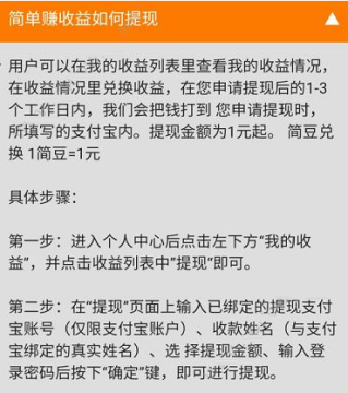 简单赚对账户余额进行提现申请之后,其时间是1-3个工作日内就可到账。1简豆=1元。