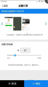 3.最后您就可以设置打赏啦,设置打赏金额,直接拖动滑块可选择金额,最低1元,最高99元,如果有小伙伴喜欢您的相册便会给您打赏哦。