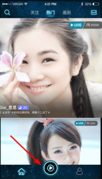 1、打开梦想直播app,在首页下方中间点击“直播”按钮;