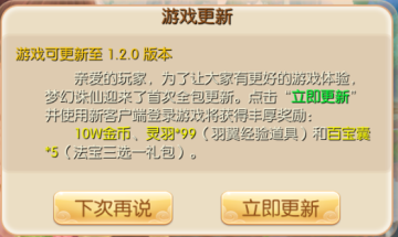亲爱的玩家,为了让大家有更好的游戏体验,梦幻诛仙迎来了首次全包更新。点击“立即更新”并使用新客户端登录游戏将会获得丰厚奖励: