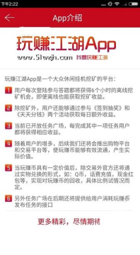 1、玩赚江湖App是一款以广告宣传、应用推广、休闲网赚为主的应用;