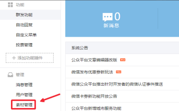 首先登陆微信公众平台,登陆后点击左侧管理中的素材管理打开。
