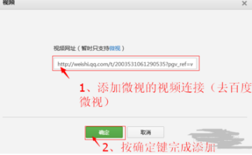先介绍第一种:添加在线视频链接,链接到某个视频文件。在素材管理视频菜单下,我们点击“微视”,跳出添加微视视频链接的界面,我们将复制好的微视频链接黏贴到地址栏,点击“确定”,如果上传成功,会出现一个新的预览界面,点击下端保存,视频就上传成功。即:素材管理---视频---微视---添加复制链接(限微视频链接)---确定---查看预览图---保存。