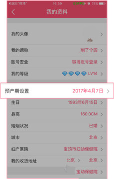 1、在“我”的界面中,点击“个人头像”,在“我的资料”界面中,选择“预产期设置”;