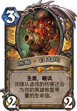 3费,身材2/2,特效:圣盾、嘲讽,该随从造成的伤害还会为你的英雄恢复等量的生命值。