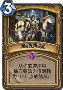 简评:你要的过牌,暴雪爸爸再次给你找来了,快攻除了过牌之外还需要随从,在对方清场之后,我们需要能够在铺一波的能力,三教九流能够让你用3点费用获得3张法力消耗为1的随从,也就是你铺上三个随从最多需要6点费用,如果在后期还能通过一些加成来提高这些随从的质量,并且1费的随从中很多是一些具备特殊效果的随从,这样卡牌的加入,解决了快攻骑士缺少过牌能力的问题。我想以后的过牌将不会是个大的问题。至于你们要说英雄技能,那就带个芬利吧。
