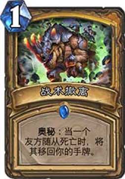 简评:可能奥秘快攻骑即将崛起了吧,这张奥秘是非常变态的一张奥秘,首先他具备灵活性,这是其他的骑士奥秘所不具备的。因为费用很低,我可以在需要使用的时候将其挂上去,比如我现在的佛丁要送死了,我就挂上战术撤离,这样我吃掉对方之后还将佛丁的卡牌拿回了手里面,并且还获得了亡语效果,一箭三雕。另外也可以将这个技能用在斩杀过墙上面,冲锋和战术撤离的配合。这个战术撤离的灵活程度能够让我们干很多大事,这张卡很棒。
