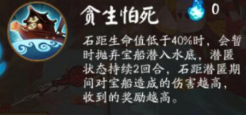 贪生怕死:石距生命值低于40%时,会暂时抛弃宝船潜入水底,潜匿状态持续2回合,石距潜匿期间对宝船造成的伤害越高,收到的奖励越高。