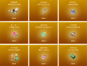 满足条件的玩家回归后,可获得丰厚的回归登录奖励。持续七天,玩家每天登录即可领取相应礼包。(活动所送的珍品装备不能交易;活动所送的宝宝为绑定无法交易)。