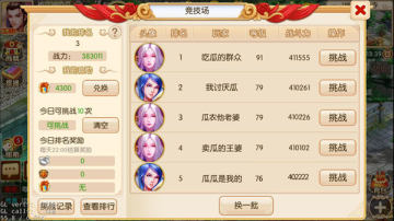 点击挑战即可挑战相应玩家, 每个玩家每天可免费挑战10次。根据用户会员等级购买次数。正在战斗中的玩家无法被选择对手。每天22点整发放排名奖励玩家可在竞技场内获得荣誉勋章,银两,竞技场礼包,荣誉商店通过荣誉勋章可换取普通道具盒顶级伙伴秘籍。