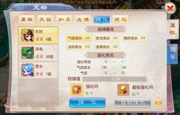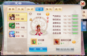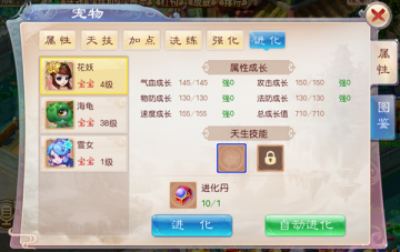 通过消耗归元露或超级归元露改变宠物各成长属性,有一定几率将当前宠物进化为更高类型宠物。
