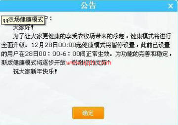 为了能让大家更健康的享受农牧场带来的乐趣,健康模式将进行全面的升级,12月28日00:00起健康模式将暂停设置,此请已经设置的用户在28的00:00-6:00间正常生效。为功能的完善和稳定,新版健康模式将逐步开放,谢谢您的支持!祝大家新年快乐!
