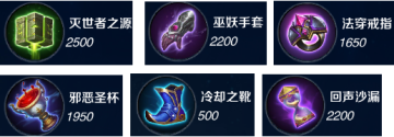 后期装备:灭世者之源,巫妖手套,法穿戒指,邪恶圣杯,冷却之靴,回声沙漏