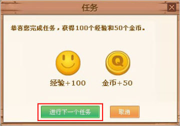 完成该任务,获得100个经验和50个金币。同时,可选择“进入下一个任务”。