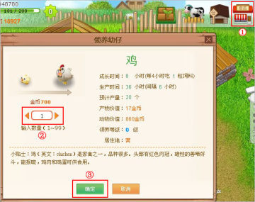 操作方法:点击“商店”图标,选择“鸡”,数量选择“1”,点“确定”即可;