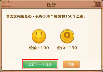完成任务,获得100个经验和150个金币。同时,可选择“进行下一个任务”。