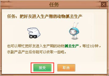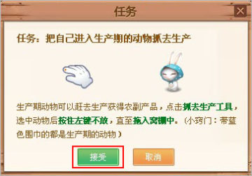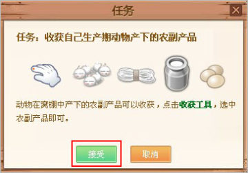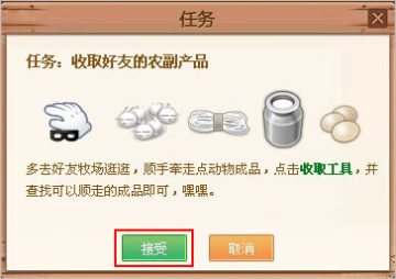 操作步骤:在QQ牧场好友列表里面,点击好友昵称,进入好友牧场后,点击QQ牧场下方工具栏“手”,再点击窝或棚中的农副产品即可。任务完成后,获得100个经验和450个金币。点击“确定”按扭,完成最后一个任务。