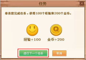 完成任务,获得100个经验和200个金币。同时,可选择“进行下一个任务”。