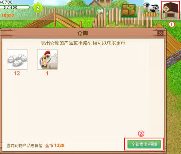 操作方法:点击QQ牧场右上方的“仓库”图标,可选择全部卖出,也可选择单个产品卖出,最后点击“全部卖出或捐赠”即可。
