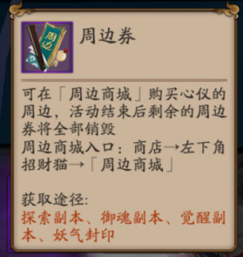 周边券获取方式:可通过探索、御魂、觉醒、妖气封印等玩法掉落该道具