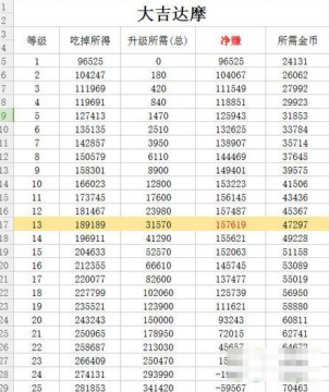 大吉达摩可通过升级来获得更多的经验,但是大吉达摩升级也需要不少金币,通过以上的大吉达摩升级经验及花费汇总表,可以看到大吉达摩在13或者14级吃掉,经验和金币花费算是比较均衡的
