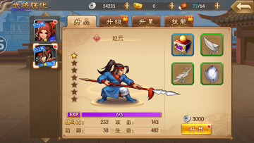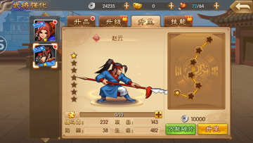 武将升品:武将达到一定等级后可通过消耗材料进行武将升品,升品后将有大量属性提升。