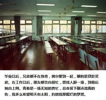 青春是合不上的书,我们用初中三年去盼望高中三年,我们用高中三年去憧憬大学四年,而用大学四年去怀念中学六年,最终用我们的一生去祭奠我们的青春。