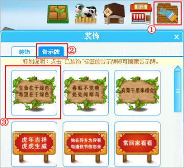 1、点击农场右上角的“装饰农场”=>>“告示牌”(或点击左上角的“告示牌”进入),然后点击您所喜欢的绿色风格告示牌,即可装扮成功;如图: