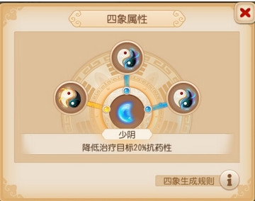 法宝第3次进阶后,拥有3条两仪属性时,会根据这3条两仪属性自动获得一条四象属性。四象属性赋予法宝一个特殊的效果,包括四种:太阳、少阳、太阴、少阴。