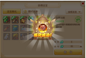 在日常活动中可以获得法宝碎片,多余的法宝碎片可以分解为仙气,仙气可以用于提升法宝等级。
