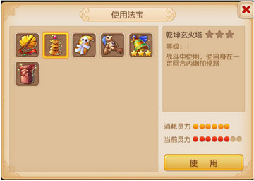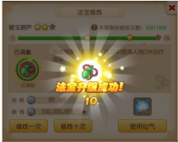 法宝可以消耗银币直接修炼升级,也可以通过消耗仙气进行修炼升级。