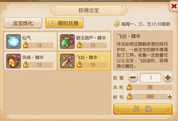 分解不需要的法宝精华,可以获得法宝积分。法宝积分可以兑换其他法宝精华和仙气。每周一、三、五的12:00会刷新可兑换的法宝精华的种类。每次刷新出现3种。法宝精华的兑换价格会根据兑换人数产生浮动。