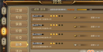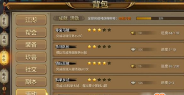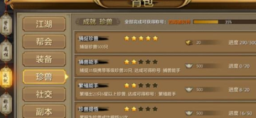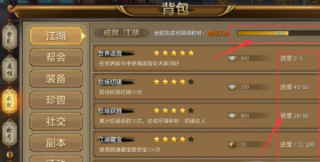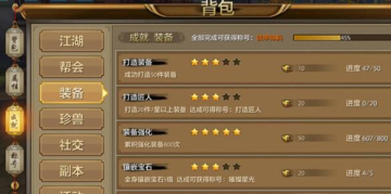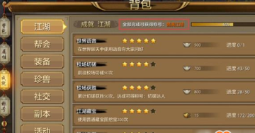 世界语音,校场切磋,校场获胜,江湖仓图,稀世宝图,五个系列。全部完成可以获得称号,誉满江湖。