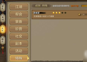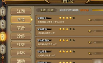 帮会抢红包,帮会发红包,帮会聊天,帮会练功,帮会行酒令,帮会炼金,帮会守卫,七个系列。全部完成可以获得称号,草莽英雄。
