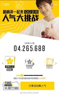 同时,杨洋在QQ空间开启“人气大挑战”活动,每位参与“助力杨洋”活动的粉丝都将获得专属Fans铭牌,而当关注杨洋认证空间的人数达到一定数量,便会解锁个性赞、礼物、杨洋青春相册等秘密好礼,参与活动的用户都有机会获得杨洋专属周边。