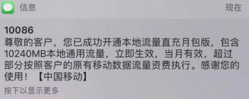 2、给手机充了10元的流量包,就能收到以下短信显示办理成功了!