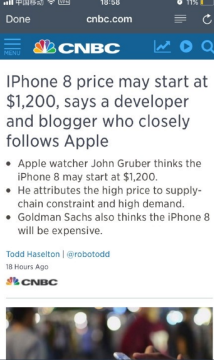 周一,多次成功预言苹果产品售价的科技观察家John Gruber向CNBC表示,他预计iPhone 8初级版本的售价可能超过1200美元。