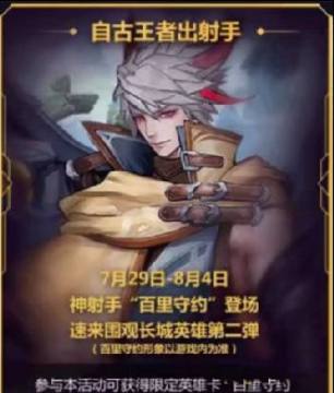 7月29日射手百里守约上架参与“自古王者出射手”活动,可获得限定英雄卡:百里守约