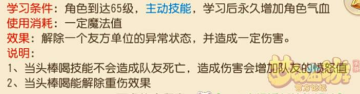 功效:解除一个友方单位的异常状态,并造成一定伤害。每升一级会增加2点气血